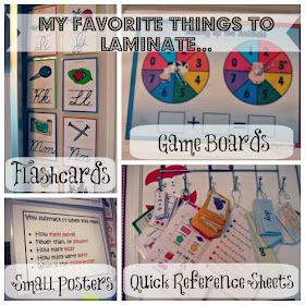 Now--laminator sleeves...that is where you can get spendy if you are trying to stay with name brand pockets. Here's the secret--your laminator doesn't know the difference! Once I used up all the sleeves that came initially with my laminator, I searched around on Amazon.com and discovered sellers who sold them in bulk 100pc boxes. Would you believe I have to buy one of those every school year?? But laminating is great for so many things...including posters for your walls, important photos, paper puzzles.